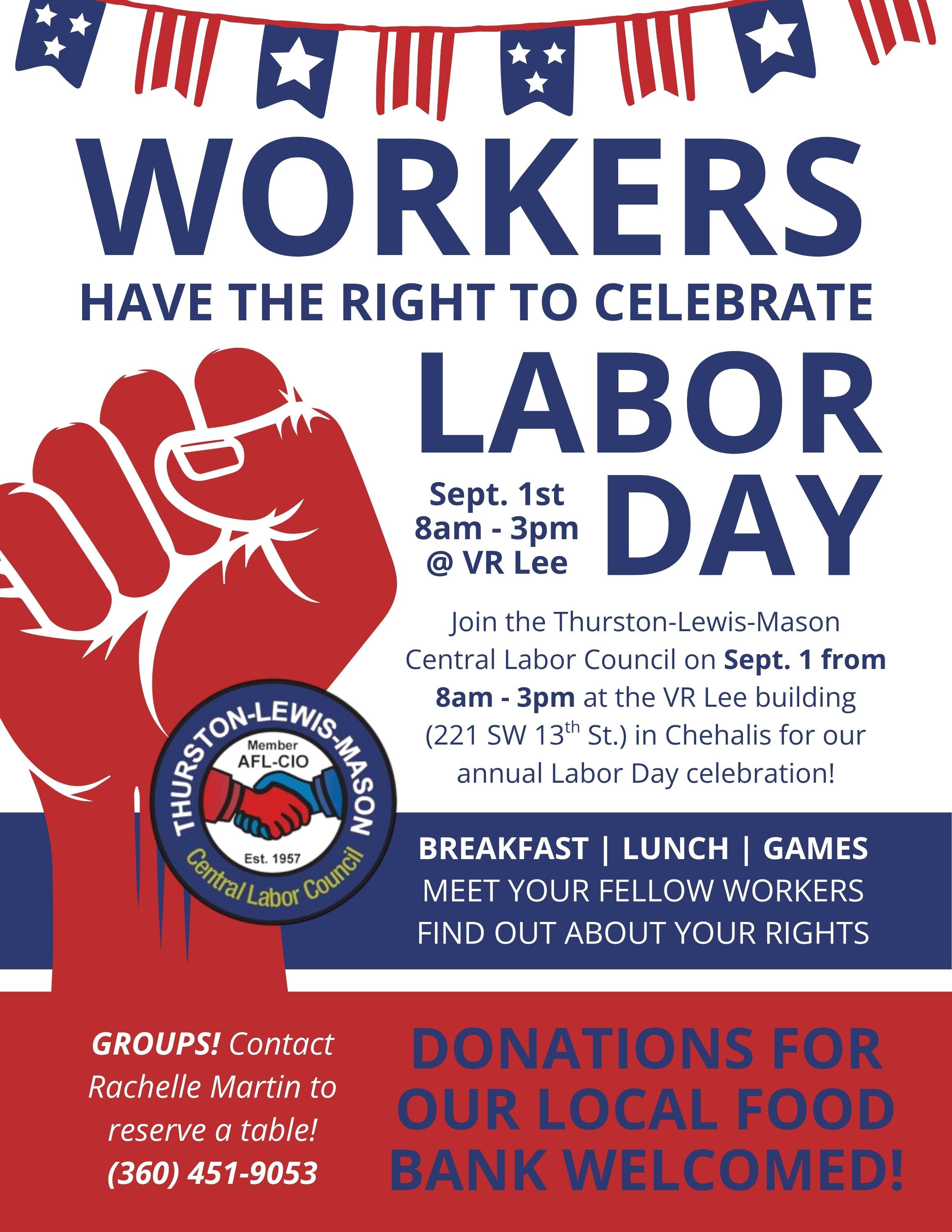 Join the Thurston - Lewis - Mason Central Labor Council for a Workers Labor Day celebration on September 1st from 8:00 AM to 3:00 PM at the VR Lee Building in Chehalis!