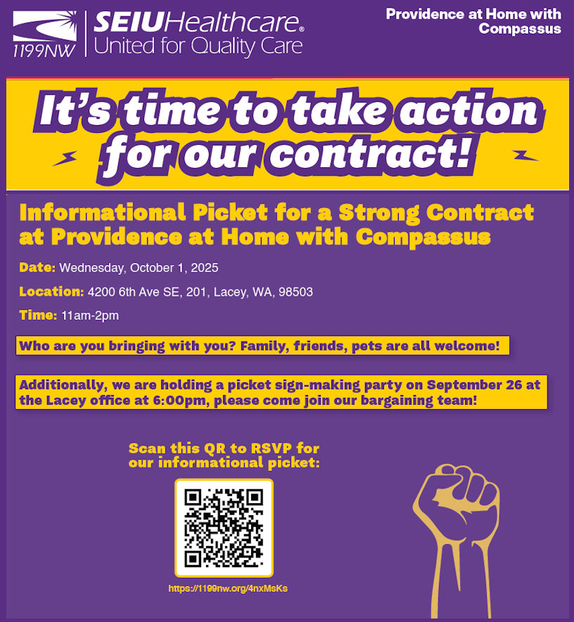 | SEIU 1199NW members working at the Providence At Home With Compassus hospice have been bargaining with management for months with the goal of raising standards and benefits so their patients can receive the best quality of care. Unfortunately, the union says since private equity company Compassus took over Providence At Home, quality of care at the facility has diminished and workers' benefits have been changed without bargaining. It’s time to let Compassus know that our community stands with these vital healthcare workers! Join SEIU 1199NW members at an informational picket at 11:00 AM on Wednesday, October 1st at the Compassus Lacey Hospice (4200 6th Ave SE, 201, Lacey, WA, 98503 - click here for a map.) Raise your voice and tell Compassus to bargain a fair contract with these workers who care for some of the most vulnerable. For more information on the picket and to RSVP click here.