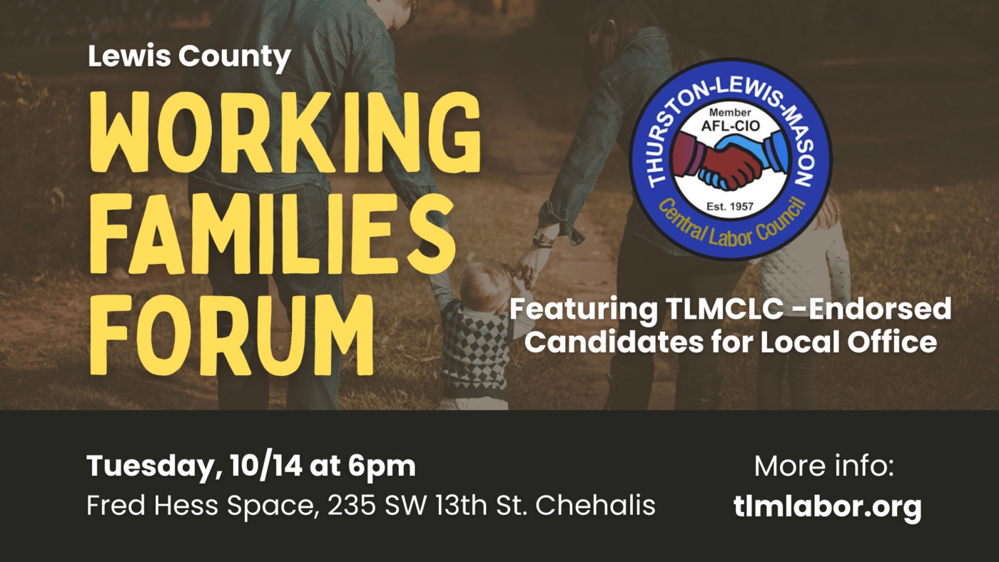 | You know that working families are the backbone of our community in Lewis County... but do you know which candidates asking for your vote in November will fight for families like yours? Find out at 6:00 PM on Tuesday, October 14th when the Thurston - Lewis Mason - Central Labor Council hosts a Working Families Forum at the Fred Hess Kitchen (235 SW 13th St, Chehalis, WA 98532 - click here for a map.) This forum will feature Labor-endorsed candidates like Ally Pickard, Ray Chapman Wilson, and Jessie Carver who are committed to strengthening working families, supporting living wages, protecting worker rights, and building economic opportunity for everyone in Lewis County. This is your chance to ask questions, learn about their positions, and understand how they plan to represent YOUR interests in local government before you head to the polls in November. To find out more information and to RSVP, click here.
